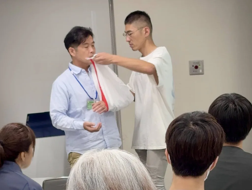 実習では、身近な物を使ったファーストエイドを学びました。もしもの時に身の回りにあるもの(例:タオル、雑誌など)を代用して、応急処置を行う方法を実習しました。災害時など、十分な資機材がない状況でも対応できる実践的な知識を深めました。