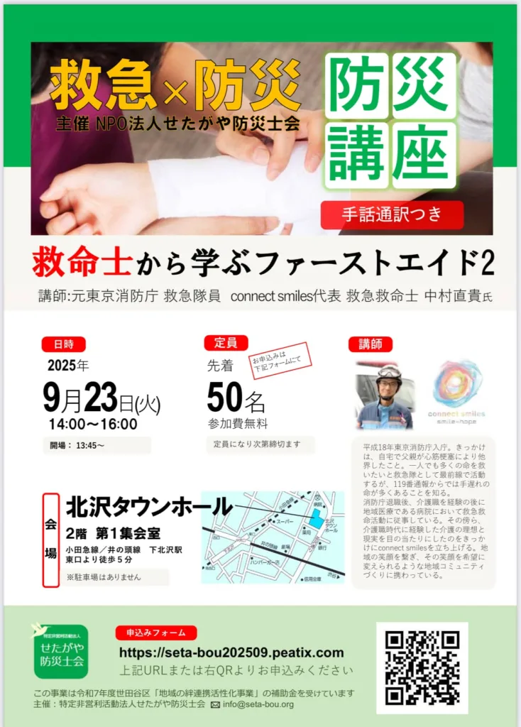 去る9月23日、北沢タウンホールにて、元救急隊員を講師にお招きし、「救急✕防災 救急救命士から学ぶファーストエイド2」を開催しました。※手話通訳つき講座。
